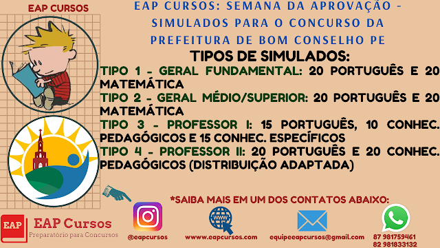 SEMANA DA APROVAÇÃO - O EAP CURSOS REALIZARÁ UMA SÉRIE DE SIMULADOS E AULÕES PARA O CONCURSO PREF. DE BOM CONSELHO PE 2022 - VEJA COMO PARTICIPAR!